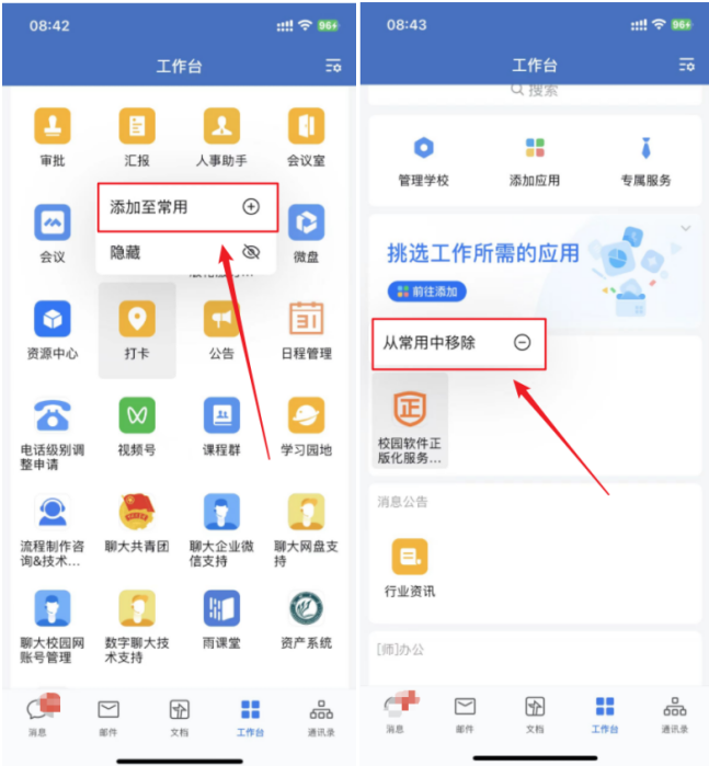 点击进入下方工作台,通过长按,组件可进行常用添加和移除。