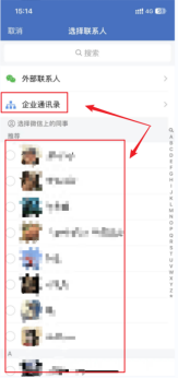 (2)进入选择联系人界面后,可以选择企业微信内部联系人,也可选择微信上的联系人。