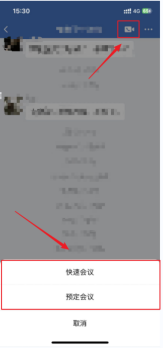 在群聊页面中,点击右上角【摄像机】按钮,在下方选择【快速会议】或【预定会议】,即可发起会议,如下图所示。